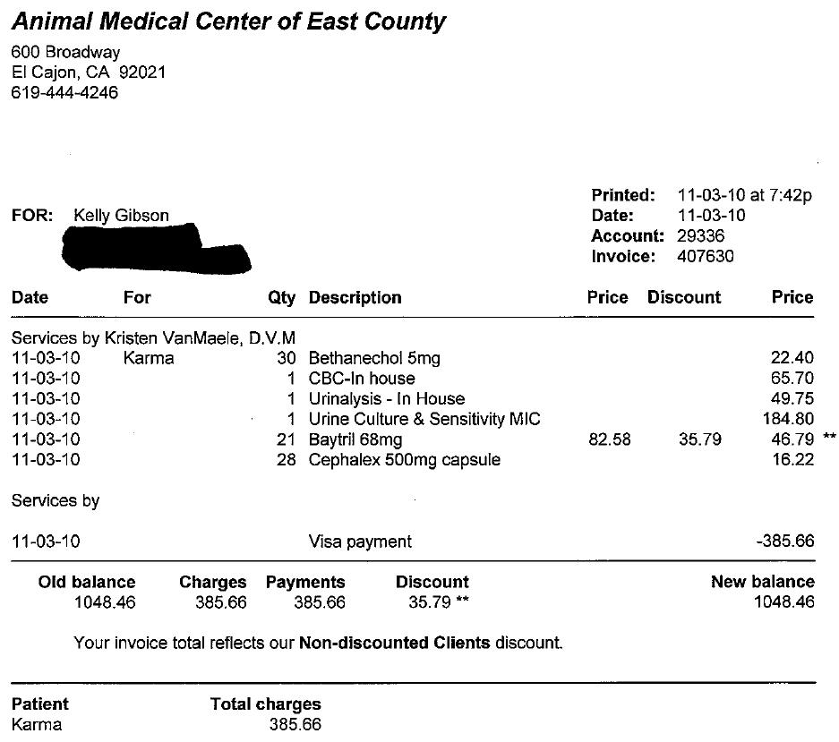 Or donations can be made directly to the vet hospital, address and phone # on invoice above.